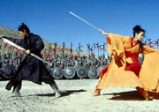 Memorabili le sequenza del duello solo immaginato da Senza Nome (interpretato da Jet Li) e Cielo (Donnie Yen), commentato dalle note di un musico cieco, scandito dal rumore della pioggia; liquido, fluido come solo l'acqua che scorre sui tetti o in rivoli nei giardini può essere. Splendida la fluttuante danza di morte tra Neve che vola (una sensuale ed elegante Maggie Cheung Man Yuk) e Luna (interpretata dalla sempre più affermata Zhang Ziyi), un tripudio di rossi e gialli, un vorticoso crescendo di venti e forze della natura rotto dalla beffarda risata che la giovane apprendista fa appena prima di morire trafitta dalla spada della rivale.