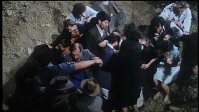 Ecco dunque che il quadro di centralità del singolo prospettatoci in apertura viene subito respinto sul banco della Storia. Da qui comincia una linea di composizione a cui i Taviani rimarranno a lungo fedeli, quella che va dal singolo al piano della contaminazione col gruppo, dall'episodio alla favola. Nel caso dei Taviani il gruppo assume configurazioni affatto particolari: non siamo davanti al corpo imponente e sinistro delle masse cui tanto cinema ci ha abituati e neppure dinanzi alla solitaria resistenza dell'individuo al magma amorfo della folla; l'insieme sociale nel loro cinema è appunto “gruppo”, manciata di elementi sparuti (ancorché “affini” come ne La notte di San Lorenzo e ne Le affinità elettive) lontani dal produrre aggregazione nel venire a contatto e anzi inclini a un'immediata dispersione. A questo proposito pensiamo ai molteplici esempi della piazza in San Michele, della frantumazione delle due comunità in Sotto il segno dello scorpione, alle molte occasioni di raduno in Un uomo da bruciare, per finire con La notte di San Lorenzo, il cui campo visivo viene continuamente occupato da piccoli gruppi di soggetti in raccolta o in marcia, per poi deflagrare in immagini sgombre e mute da ogni brulichio.