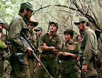 La prima metà del film, L'argentino, è una marcia trionfale assolutamente priva di qualsiasi scossone. Dall'inizio, con le lunghe discussioni fra il medico Guevara e l'aspirante ribelle Castro, fino alla conclusiva presa di Santa Clara, il percorso è netto, denotato narrativamente dalla suspense per il pericolo oggettivo in cui si trovano i singoli personaggi, ma mai realmente messo in conflitto con istanze potenzialmente negative per il progetto in generale. C'è, ovviamente, il nemico Batista, ma è un nemico che cinematograficamente parlando funziona ben poco: tutti sanno che cosa accadde, tutti sanno quanto e come fu vittoriosa l'avanzata dei barbudos di Castro. Quello che sorprende è piuttosto come Soderbergh non abbia rimpiazzato questo antagonista poco funzionale con altre istanze oppositrici: non ci sono lotte intestine, non ci sono dubbi né fantasmi in Guevara, ogni conflitto fra le parti in gioco (e sì che ce ne furono, tra le varie parti della guerriglia, spesso tali da mettere a repentaglio l'intera rivoluzione) viene minimizzato e mantenuto fuori campo. Né si vedono cedimenti nello stesso gruppo di Guevara: ciò che si vede in L'argentino è un gruppo compatto di esseri umani che rispondono con amicale rispetto ai comandanti, sopportando fame e sete e ferite e stenti ma mai dubitando, senza rivalità o cedimenti morali. Soderbergh non utilizza alcuna delle possibilità di conflitto che la Storia gli offre. Né interne a Guevara, né relative al suo gruppo, né intestine rispetto alla guerriglia. L'argentino è percorso puro: una linea netta che congiunge il dottor Ernesto Guevara al Che vittorioso, senza che mai, nemmeno per un istante, un conflitto drammatico movimenti realmente la linea dell'azione. Invece di un drammaturgicamente comprensibile alternarsi di tesi, antitesi e sintesi che si trasformano in nuove tesi su un piano superiore, si assiste alla parata delle sintesi: i conflitti vengono messi di fronte allo spettatore solamente una volta che sono stati risolti. Non sono gli uomini i protagonisti, è l'idea di un uomo, ed è un'idea vittoriosa in partenza. Il primo atto scorre così, in semplice (ed esaltante, a patto di non aspettarsi una scansione drammaturgica tradizionale) climax verso il trionfo.