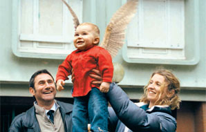 Se il piccolo Ricky assorbe tutta l’attenzione e la curiosità dello spettatore, la vera protagonista del film, quella a cui è richiesta la prova più ardua, rimane tuttavia Katie (interpretata dalla brillante Alexandra Lamy). Una mamma estraniata da un evento così intimo e insieme straordinario, che, tra orrore per la diversità e sorpresa per il meraviglioso potenziale, cerca di inventarsi una vera e propria “educazione al volo”. Katie tenta di escogitare un sistema per far sperimentare al bambino la sua mobilità speciale. Cerca di metterlo in sicurezza, come se dovesse invitarlo a gattonare o a camminare. Ci prova, ricorrendo ad espedienti pratici di protezione (il casco, i pezzi di spugna intorno al busto, le ginocchiere), ma tutto scivola facilmente nel ridicolo e nell’improbabile. Ciò che manca è un elemento fondamentale del rapporto educativo: l’imitazione. Ed è proprio questo impedimento materiale che destabilizza e disorienta l’atteggiamento materno del “prendersi cura”, sbaragliandolo e facendolo girare a vuoto. La capacità/possibilità di mostrare il gesto scivola in un’impasse senza soluzioni. Come innescare, allora, quel processo cognitivo, imbricato nell’azione corporea (8), senza poter esortare il bambino a ripetere il gesto, senza ali da mostrare in azione? Eppure, tutto avviene comunque, il meccanismo del volo si innesca spontaneo, la conoscenza del librarsi e dello sfruttamento delle correnti aeree è acquisita tutto d’un tratto, senza passare per troppe esitazioni né per la percezione di movimenti da iterare. Forse perché quello che si legge in questa storia è la spontanea predisposizione al volo, ovvero l’innato istinto alla libertà, incapace di rientrare in qualsivoglia schema pedagogico? Oppure svela semplicemente una delle tante tracce di qualche mistero imperscrutabile, che esiste nonostante la nostra avidità conoscitiva, e che prelude ogni possibilità di controllo, aleggiando indisturbato nei ripiegamenti delle nostre esistenze? L’unica certezza è che l’applicazione di un atteggiamento improntato alla cogente realtà qui non funziona, risulta grottesco, trascinando lo spettatore in un’oscillazione tra ammirazione pura e ilarità singhiozzante. Perché ciò che si vuole a tutti i costi controllare e capire (si pensi al tentativo di attaccare le premature ali con il nastro adesivo e poi quel cercare di misurarle o studiarne la natura anatomica) si inceppa in vicoli cechi, tanto sottili quanto ridicoli. E il regista sa bene che non c’è altra via d’uscita alla comicità, non v’è alternativa che possa sembrare accettabile, data la sua esigenza di disciplinare i fermenti della magia. Nella scena del supermercato, infatti, la scoperta del bimbo/uccello chiarisce subito quanto a volare è solo lo sguardo, è solo il desiderio di inseguire l’impressione inattesa, mentre la storia rimane ben ancorata al suolo, alla pesantezza del corpo, che si eccita e si sollazza verso quel fenomeno strambo. Sembra non esserci un granché di irreale (qualcuno grida che il bimbo è telecomandato) e l’unica preoccupazione è quella di catturare l’esserino ribelle. Perché, chi non è disposto a credere, chi non cede all’incredibile, non può che divertirsi con la concretezza delle proprie risate. In fondo, è solo la constatazione che la leggerezza della fantasia ha, inesorabilmente, bisogno di fede.
