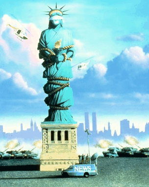 È forse proprio questo il lato più amaro e disperante della farsa ordita da Dante e da Burke: il ritratto impietoso di una nazione irrimediabilmente incapace di individuare la giusta direzione, sviata com’è dall’individualismo e dalla ricerca del piccolo profitto. Può darsi allora, come sostiene Christopher Varney (3), che l’accumulo di personaggi e situazioni sia il limite del film, soprattutto se confrontato con l’asciuttezza e la linearità del citato Sesso e potere. D’altra parte è però difficile non vedere un chiaro disegno degli autori dietro al composito mosaico di un popolo estremamente conservatore per convenienza più che per convinzione (Farley che passa dall’essere liberal allo slogan “L’America come dovrebbe essere”, il governatore cinese del Rhode Island che vuole chiudere a sua volta le frontiere a nuove ondate di Cinesi …) ossessivamente attaccato a ciò che ha (come le famiglie dei paramilitari, lanciarazzi in casa, sfiducia nel governo e timore di perdere il posto di lavoro) e senza idee credibili per gestire una crisi e, più in generale, per progettare il futuro.