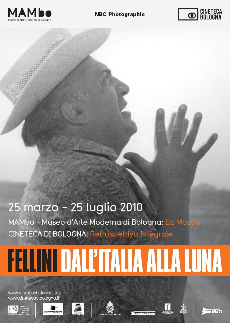 Fellini. Dall’Italia alla Luna, curata da Sam Stourdzé, analizza la nascita e lo sviluppo del mito felliniano liberandosi dall’approccio cronologico per avvicinarsi al regista attraverso le sue ossessioni: quelle che lo hanno ispirato, il suo immaginario onirico, le scene, le location e i backstage dei film, l’iperproduzione iconografica della cultura popolare contemporanea. La mostra mette in relazione estratti di film, documenti fotografici, resoconti giornalistici, immagini televisive, disegni, documenti e materiali legati al lavoro del regista e arriva negli spazi del MAMbo nell’anno in cui ricorre il 50° anniversario dell’uscita de La dolce vita con un allestimento completamente rivisto. Dal Jeau de Paume di Parigi – dove è rimasta allestita con grande successo di pubblico fino al gennaio scorso con il titolo Fellini, la grande Parade – l’esposizione approda a Bologna con un diverso titolo e due sezioni del tutto nuove: "La magia del fuori sinc" – curata da Tatti Sanguineti e Roberto Chiesi e dedicata a Fellini e la voce, con numerosi materiali audiovideo – e una carrellata di manifesti originali dei principali film del maestro riminese, provenienti da una collezione privata ed ora acquisiti dalla Cineteca di Bologna.