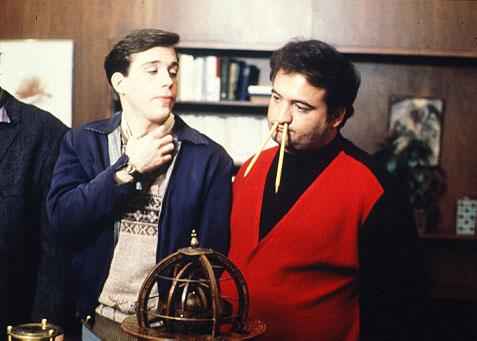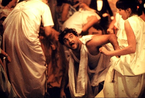 L’interno della casa del gruppo Delta è allora un locale, un pub, un centro di ritrovo, un sotterraneo di culture antagoniste che preludono al grande concerto dei Blues Brothers, al raduno illegale, all’idea dell’aggregazione musicale (fondamentale la colonna sonora di Animal House) e al suo potenziale esplosivo (un rito dionisiaco come il toga toga, tutto il potenziale, compreso quello sessuale, di un piacevole “stare insieme”). Se da un lato si può avere l’idea che i Delta siano solo un gruppo votato all’autodistruzione, dall'altro è evidente che si tratta invece di un gruppo che ha chiaro in mente il suo obiettivo: resistere contro l’Amministrazione Centrale, contro un sistema di controllo che tende a costruire una rete preferenziale con i propri sostenitori. E così se il preside del college si avvale dell’appoggio del gruppo Omega per trovare un pretesto per cacciare i Delta dal campus, a fare da contraltare ecco il professor Jennings (Donald Sutherland), sorta di Timothy Leary, annoiato da quel che insegna e assiduo consumatore di droghe con i propri alunni. E poi, a dirla tutta, come si fa a non avere a cuore il personaggio di John Belushi, Bluto, che si presenta ubriaco urinandovi sulle scarpe? Che si schiaccia le lattine sulla fronte ed è un’energia continua che si comprime ed esplode, con un movimento del proprio personaggio che lo ha immortalato (quanto c’era di questo uomo di origini albanese in quel personaggio!!!)? È lui anche il filo conduttore di tutte le goliardie: lo scherzo del cavallo nella sala del preside, la guerra del cibo in sala mensa (gag tipica con tanto di torte in faccia ed inseguimenti), il voyeurismo dalla finestra su ragazze in vestaglia, fino al toga party, che permette a Landis di mischiare i generi e finire con un goliardico omaggio al cinema avventuroso, con un Belushi vestito da pirata che sembra fuggire in un ammutinamento, da lui stesso provocato, su alberi maestri e lanciarsi con delle funi da un lato all’altro di una enorme nave in preda alla follia generale.