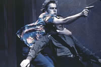 La prima parte del film, del resto, è tutto un crescendo sforzato. Tutto, perché questo mondo mostruoso e carnevalesco possa fare da rima, per intensità, all’incontro che, gradualmente, Luhrmann prepara, quello tra i due protagonisti, e su cui lavorerà per assenza. Giulietta e Romeo sono dalla stessa parte perché sono estranei, superiori. Sono investiti da una luminosità diversa e tendono alla rarefazione dei colori. Entrambi sono esseri acquatici, tutta la loro progressione è segnata dall’acqua, che è spessore, protezione e forza incontrollabile: prima l’acquario, poi la piscina, subito l’amore e, poi, i presagi di morte. I blocchi linguistici e drammaturgici costituiti dai due protagonisti e dal resto del mondo proseguono concatenati nel loro sviluppo, nell’inno, senza argini, della quantità, principio sacro in nome del quale tutto diventa possibile: sono ammessi gli sguardi in macchina, gli zoom continui e un sonoro continuamente allusivo. La cifra stilistica risultante è il cliché, rilanciato come sguardo di intesa tra il regista e lo spettatore. In Romeo + Giulietta di Luhrmann c’è il western tanto quanto il gangster movie, la struttura schematica del duello, il concetto di onore e lo sguardo dall’alto delle tragedie metropolitane apocalittiche da giorno dopo il disastro. La città tra i fumi delle battaglie si risveglia in una luce desertica e la polizia è uno sguardo verticale, non sempre efficace e, alle volte, del tutto impotente.