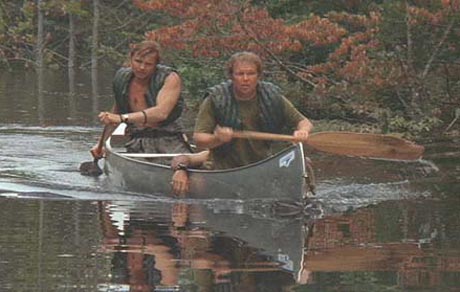 Questo, dunque, il cuore di Un tranquillo weekend di paura, l’incontro/scontro non solo con una Natura che – idolatrata, idealizzata, specialmente dallo spavaldo Lewis –, in realtà, più che essere un'antitesi della civiltà che distrugge per costruire solamente per sé (come ne Il fiume di smeraldo), è uno schermo dietro al quale si celano le colpe e le paure di uomini vacui che anelano ad una vita più pura sì, ma soltanto a patto che si riesca a tornare in tempo “per la partita in tv” della domenica sera. Dietro tutti gli alberi e al di là di tutti i vortici d’acqua non c’è un pericolo atavico, ma, da un lato, uomini che attentano alla vita dei protagonisti e, addirittura, alla loro virilità (lo stupro di Bobby), e dall’altro le insicurezze di quattro canoisti dilettanti. Presto, infatti, al primo scontro con la realtà, i ruoli di Ed e Lewis dapprima si sfaldano e poi si mescolano fino ad incrociarsi: Lewis dà i primi segni di cedimento della propria mascolinità quando Ed lo scuote di mattina presto per farlo alzare, e invece di essere pronto a saltare in piedi fieramente, come ci si aspetterebbe dal personaggio conosciuto fino a quel momento, mugugna qualche monosillabo incomprensibile con una vocina flebile, rimanendo accartocciato dentro al suo sacco a pelo, mentre Ed sente il richiamo della foresta e va a caccia (non riuscendo però ancora ad uccidere). Ma è con lo stupro subito da Bobby da parte dei due bifolchi che avviene la svolta definitiva: quando Lewis si ferisce ad una gamba, ecco che non accenna ad alcuna resistenza, ma invece si accascia per non alzarsi mai più, di fatto eclissandosi sino alla fine del film, mentre Ed prende l’arco che solo poche ore prima non aveva saputo usare come forse avrebbe dovuto e scala niente meno che una intera parete di roccia per andare ad uccidere un uomo (della cui colpevolezza però lo stesso Ed in seguito non si dice sicuro…).