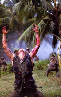 Capodanno del 1968, la contestazione sta esplodendo in tutto il globo, ma in Vietnam si festeggia il fatto di essere ancora vivi, all’inferno, nell’impossibilità della ragione. Abbandonando quindi il percorso di formazione del protagonista, la macchina da presa e la scrittura del film si concentrano poi sui modelli tra i quali oscilla il pensiero militare americano: il modello Barnes, che tra il vendere cara la pelle al nemico e il vendicarsi contro di lui preferisce spesso la seconda opzione (il tremendo assalto al villaggio, la parte più concreta e violenta del film), e il modello Elias (grande Willem Dafoe), fatto invece di morale della vita e disprezzo per l’esaltazione militare. Il secondo problema di questo film dunque sta proprio in questo, nel didascalico opporsi dei due modelli (significativa è la parte del riposo notturno, tra un gruppo che ascolta White Rabbit dei Jefferson Airplane e un gruppo che trattiene la violenza mangiando lattine di birra), dualismo dal quale il protagonista non riesce ad emergere con una posizione propria, uno sguardo super partes (infatti Chris terminerà il proprio viaggio vendicandosi del sergente Elias, con un gesto impuro quindi). Non serve allora la voce off del protagonista che legge le lettere a casa (“cercare la bontà è un significato in questa esistenza”), per quello che sembra più un espediente narrativo (ancora Apocalypse Now) piuttosto che una vera riflessione, una presa di coscienza. Rimanendo alle citazioni, e agli spunti di confronto, inevitabile è, come si è visto, l’accostamento ad Apocalypse Now (1979) di Francis Ford Coppola, poiché in entrambe le pellicole c’è un percorso “conradiano” verso il male, ed entrambe le pellicole terminano con quella che viene considerata l’estirpazione del male (ma Coppola era più credibile, sia nella messa in scena sia nella ricostruzione davvero assurda del fronte). Particina anche per Il cacciatore (1978) di Michael Cimino, quando nella giungla compare un cerbiatto (la caccia di Robert De Niro). Anche se la cosa migliore del film si vede dopo il grande conflitto/mattanza notturna, quando “arrivano i nostri” derubando i cadaveri dei propri commilitoni. George A. Romero, lo aveva già raccontato molti anni prima…