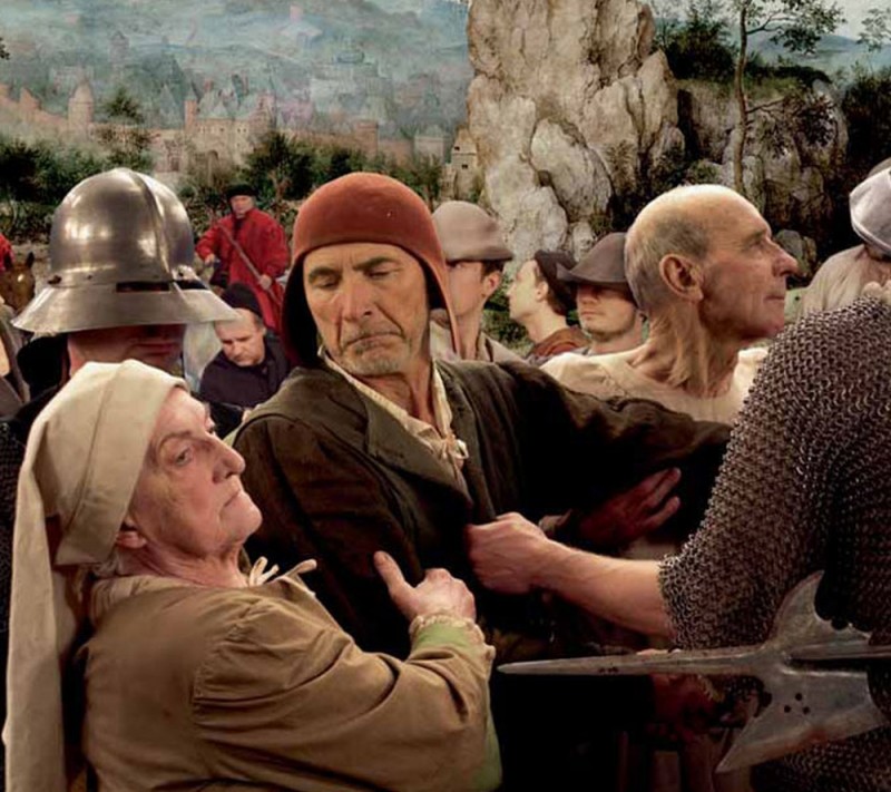Il dipinto, un olio su tavola datato 1564, ripropone un’attualizzazione al Cinquecento fiammingo della scena biblica della Passione, a significare la corrispondenza profonda tra le persecuzioni subite da Cristo e quelle imposte dai dominatori spagnoli a coloro che si sospettavano vicini ai movimenti religiosi riformatori. Così Gesù viene condotto al Calvario da soldati in giubba rossa al soldo del re di Spagna Filippo II, nell’indifferenza dei personaggi che lo attorniano, quasi invisibile allo spettatore per quanto sia collocato al centro dell’opera. Simbolo di Dio, il mugnaio guarda tutto dall’alto della rupe su cui è collocato il suo mulino, mentre in primo piano, unica a manifestare dolore, Maria è confortata dalle pie donne e San Giovanni. L’articolata composizione pittorica, con i suoi differenti livelli di prospettiva, prende vita nel testo cinematografico in una serie di scene e tableaux vivants che ne isolano i gruppi plastici e le azioni, osservandone il dispiegarsi in una temporalità in cui i gesti del quotidiano arrivano, senza perdere la loro concretezza, a farsi simbolo. Se la complessità del testo pittorico si dispiega dunque nella durata cinematografica, ogni inquadratura del film si rivela a sua volta frutto di un ricercato lavoro compositivo, in una sapiente fusione tra riprese dal vivo (nei paesaggi della Nuova Zelanda, alla ricerca di uno scenario naturale la cui intensità potesse eguagliare quello dipinto dal pittore), performance attoriali su blue screen e fondali dipinti dallo stesso Majewski su modello di quelli bruegeliani. Ne deriva un’immagine dalla straordinaria potenza visiva (accentuata da un altrettanto accurato lavoro sulla colonna sonora), insieme stilizzata e ricchissima, il cui statuto si fa incerto, quasi ibrido, riproponendo con forza la questione dei rapporti tra cinema e pittura, tra osservatore e rappresentazione.