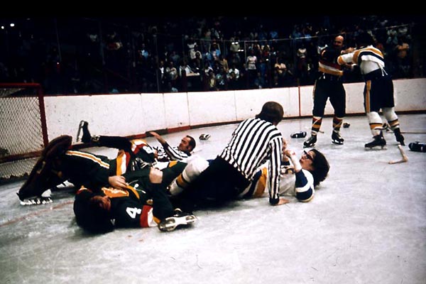 Visto oggi, a più di trent’anni dalla sua realizzazione, Slap Shot (dalle nostre parti Colpo secco) di George Roy Hill appare come un oggetto quanto meno curioso. Sembra di contemplare un pezzo unico, discrasico nei suoi pregi e difetti da renderlo difficilmente contestualizzabile in un percorso di lettura canonico. È un’originalità palese su due livelli: innanzitutto, all’interno della filmografia del suo autore, quel Roy Hill tanto amato dal pubblico quanto snobbato dalla critica (è avvilente constatare come, allo stato attuale delle cose, non esista in Italia un approfondimento di ampio respiro su colui che, tanto per dirne una, sbancò l’Academy nel 1974 con i sette Oscar de La stangata. Nel panorama critico internazionale, un punto di riferimento imprescindibile rimane il lavoro dell’americano Andrew Horton (1)). Poi, aspetto ancor più interessante, si tratta di una pellicola atipica nel calderone del cinema sportivo in generale. Non ci sono eroi. Non ci sono titoli da difendere o da conquistare (o meglio, il titolo c’è ma non è mai percepito dai protagonisti o dallo spettatore come un agognato oggetto di valore). Non ci sono momenti romantici o epici, né evidenti implicazioni politiche, né guizzi tecnico-agonistici. Insomma, la canonica liturgia dello sport è decisamente accantonata. E allora, di che stiamo parlando?