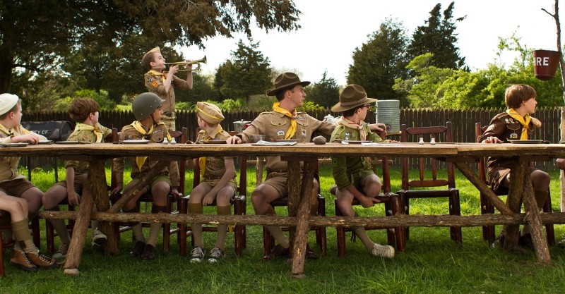 Oramai lontana appunto, ma non irreale. Allora diciamo che se i nomi, e persino le mappe, di questo luogo diegetico sono inventati di sana pianta, è altrettanto vero che i suoi riferimenti visivi esistono (esistono cioè anche nel mondo fisico e non solo in quello filmico) e presentano dettagliate determinazioni morfologiche, così come puntuale è la periodizzazione della vicenda (il 1965 appunto). Restano dunque le anomalie, ma come interventi formali su una materia immediatamente ritrovabile. Questo per dire che diamo atto ai sostenitori di un confronto serrato tra il cinema di Wes Anderson e quello di Tim Burton, rispetto a una comune vocazione al profilmico (che altro non è nel caso di Burton se non la “costruzione ex novo” di ciò che viene prima della messa in quadro), ma siamo altresì tentati a riferire della profonda diversità di soluzioni praticate dai due autori nella costruzione di questi mondi. Nel caso di Wes Anderson le operazioni sul profilmico sono da intendersi più come “giochi di composizione”, di editing interno ai singoli quadri, interventi di collage tra elementi discordanti che puntano alla preminenza del dettaglio su un insieme composto (pacifico) e composito: la casa rossa dagli interni a scatola cinese immersa nel verde dell'isola, la corda di recinzione bianca puntellata di nastrini rossi, che taglia a trequarti le inquadrature di una severa panoramica laterale durante la scena delle ricerche, il vecchio cartografo in giacchetta rossa che spacca a metà un quadro bilanciato (dalle due auto parcheggiate sui lati) e fortemente prospettico, la faccia sgomenta del caposcout che, insieme al suo coro di piccoli soldati, viene immortalato in un quadretto piramidale (qui l'anomalia è l'affollamento del quadro in opposizione ai quadri successivi disciplinati dal vuoto e dall'ordine militare della tenda del disertore Shakusky), sempre il caposcout al centro di un bunueliano quadro “cenacolare”, dove i discepoli sono sempre i piccoli e feroci scout.