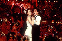 Moltissime le fonti cinematografiche e gli omaggi a celebri pellicole offerti da Luhrmann (si pensi alla sequenza del castello gotico del Duca ispirata a Hello Dolly, o la luna sorridente omaggio ai Lumière), molti e colti i riferimenti artistici a una certa iconografia bohémien di fine Ottocento (chiarissimi riferimenti alla pittura e alla cartellonistica di Toulouse-Lautrec), tuttavia l’aspetto che più di ogni altro ha colpito l’immaginario collettivo è stato l’utilizzo originale che Luhrmann fa della musica, e più in particolare della canzone pop, che acquista valore poetico-narrativo nel dipanarsi della trama. Per la prima volta la canzone non è a commento di un’azione ma è l’azione stessa, e straordinariamente la canzone non è canzone originale, composta appositamente per quel momento, ma è canzone già esistente. Di più, è patrimonio comune, parte di una realtà che lo spettatore ben conosce e può legare a momenti della propria esistenza creando un legame profondo e tanto più emotivamente coinvolgente con i protagonisti della vicenda. Il senso di compenetrazione e partecipazione emotiva a quanto accade sullo schermo diventa così assoluto, inscindibile da quella che è la vita degli spettatori, i quali, dal canto loro, si identificano nei protagonisti o nelle vicende, o, più semplicemente, ritrovano parte della loro storia in quelle canzoni che si intrecciano creando una fitta ragnatela di corrispondenze e affetti tra ciò che si svolge di fronte ai nostri occhi e ciò che è nella nostra realtà, e creando una strana alchimia che è alla base del successo di questa pellicola.