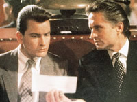 Il film si apre sulle note di una famosa canzone di Frank Sinatra, Fly Me to the Moon, ad anticipare il folle volo di Icaro del giovane Bud Fox, mentre stupende immagini di New York dall’alba al tramonto (con in bella evidenza le Twin Towers in tutta la loro funerea verticalità) scorrono in maniera accelerata. Vediamo la folla accalcarsi nella metropolitana e poi il nostro ipercinetico Fox fare il broker nella Grande Mela e gettarsi nel magico mondo di Wall Street. La macchina da presa è mobilissima, nervosa, irrequieta e riflette la velocità e la confusione di quel mondo. Scorrono numeri, monitor, telefoni: le mani si agitano, le urla si rincorrono, le parole si accavallano come in un Gran Bazar. Questo movimento forsennato di esseri umani sottende la caducità delle loro esistenze: il guadagno facile è spesso accompagnato da cadute altrettanto repentine. Si va sulle montagne russe e si sottraggono o si sommano milioni di dollari in pochi secondi, mentre le lancette dell’orologio scorrono crudeli. Il mito dell’impero economico americano ha le sue fondamenta nell’immorale e nel torbido, in una lotta spietata in cui vince il più avido. Nella prima parte del film, Oliver Stone riesce a rendere al meglio il clima frenetico della borsa, le alleanze, le coltellate alle spalle, le invidie e i rancori, le avidità travestite da mecenatismi, lo spionaggio industriale e la circolazione dell’informazione. Lo split screen moltiplica i punti di vista e le storie, facendo disperdere l’attenzione dello spettatore nelle infinite possibilità che la Grande Mela ti offre, quei quindici minuti di celebrità che l’America non nega a nessuno. Stone è anche molto attento ai particolari, si sofferma sulle psicologie dei due protagonisti principali: lo squalo Gekko, che antepone il Dio denaro a qualsiasi altra cosa, il giovanissimo broker Charlie Sheen, abbagliato da lusso e lussuria, pronto a vendere l’anima al diavolo pur di entrare nella New York che conta. “Qui si tratta di soldi, ragazzo, il resto è conversazione”, dice Gekko, ed è la summa dell'educazione “sentimentale” supportata dalla bibbia di Sun-tzu L’Arte della Guerra, che viene saccheggiata a man bassa dalla superba macchina da guerra dei manager rampanti e dagli avvocati senza scrupoli di Manhattan. Spike Lee e Paul Thomas Anderson, quasi vent’anni dopo, non faranno che riproporre il concetto che dentro la Grande Mela c’è il verme di segreti incofessabili (il furto dei beni degli ebrei durante la seconda guerra mondiale in Inside Man) e la mancanza di ogni parametro di lealtà e onestà intellettuale (il petroliere e il predicatore sono due imbonitori di folle pronti a sacrificare tutto per il loro potere in There Will Be Blood).